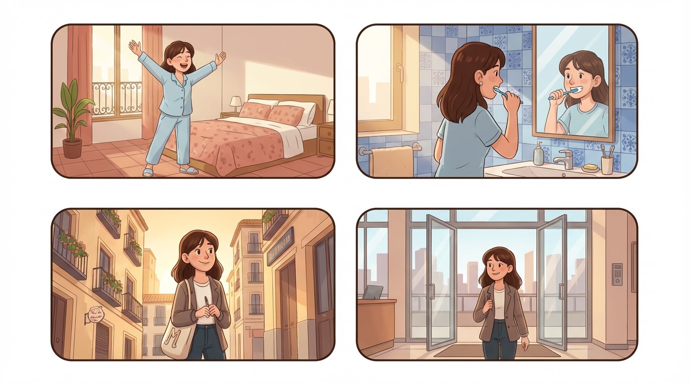 Todos los días me levanto a las siete de la mañana. Primero, me ducho y me visto. Después, desayuno café con tostadas en la cocina.